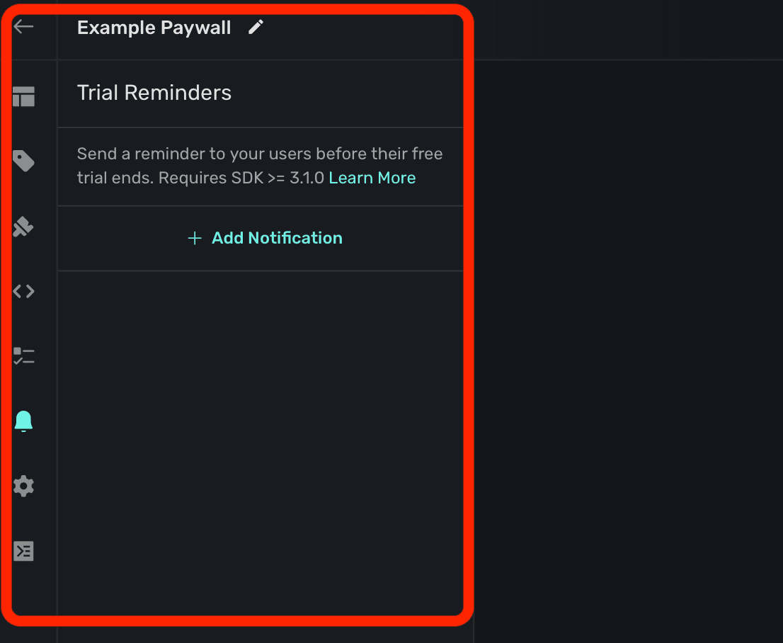 To configure a notification which displays before a free trial ends, click the Notifications button from the sidebar: