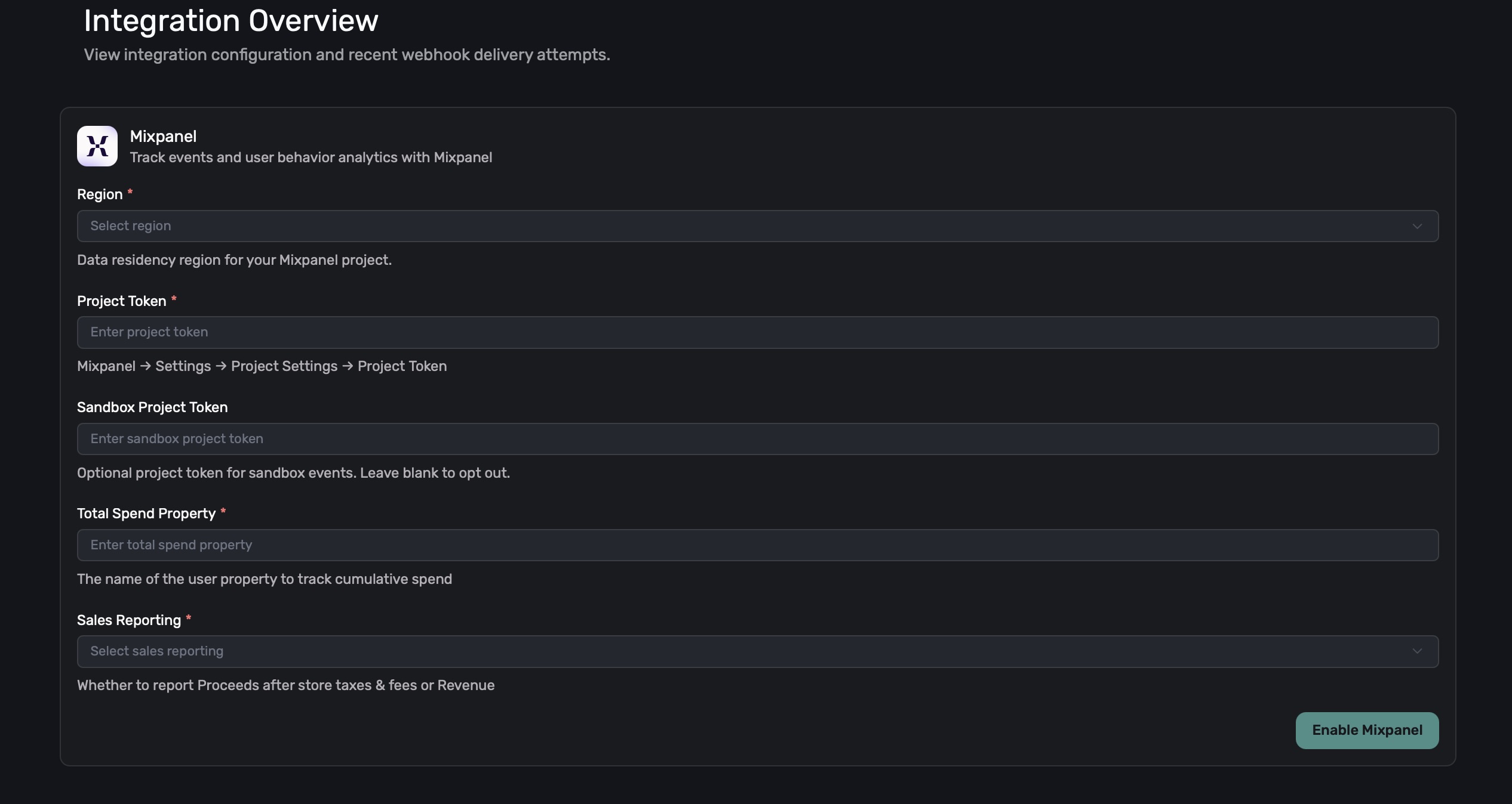 The following fields are required to configure the Mixpanel integration: